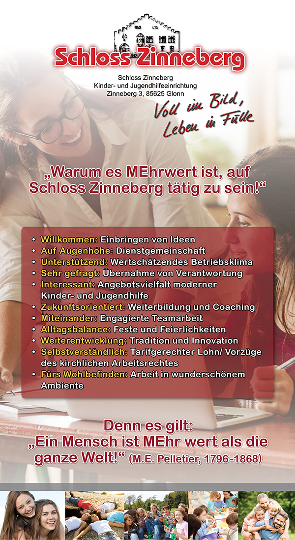 Wer sich auf Schloss Zinneberg bewirbt soll wissen - Sie sind neben Ihrer Fachlichkeit willkommen als Mensch. Unsere Unternehmenskultur stellt bei allen Notwendigkeiten, die der Aufgabenbereich und der Alltag mit sich bringt die Würde des Menschen in den Mittelpunkt, gemäß des Mottos der Ordensgründerin der Schwestern vom Guten Hirten (Träger von Schloss Zinneberg), Maria Eufrasia Pelletier (M.E.): "Ein Mensch ist mehr wert als die ganze Welt!". In diesem Sinne HERZLICH WILLKOMMEN zu unserem MEhrwert!