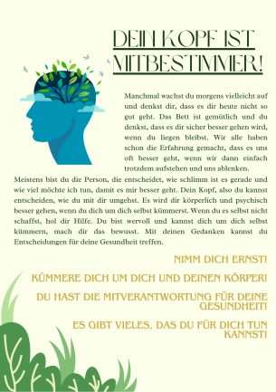 Ziel ist es, die Jugendlichen zu stärken, ihre eigenen Bedürfnisse besser wahrzunehmen und frühzeitig selbstwirksam zu handeln. Neben konkreten Hilfestellungen zur Linderung von Beschwerden wird auch erklärt, wie stark das eigene Denken und die psychische Verfassung das körperliche Wohlbefinden beeinflussen können.