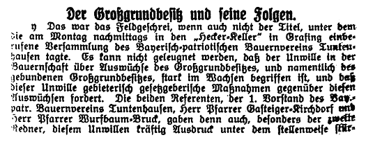 Dieser bedauerte besonders den dadurch verursachten sozialen Niedergang des Bauernstandes. Weiter beklagte er die schlechtere Bewirtschaftung von Grund und Boden und die daraus resultierende geringere Produktion landwirtschaftlicher Güter, besonders was die Viehhaltung betraf. Vor allem aber prangerte er die steuerliche Begünstigung des Großgrundbesitzers im Vergleich zu den Bauern an. Mit dem Ausruf „Bayerische Heimat dem bayerischen Volke, bayerisches Land dem bayerischen Bauern" schloss der Redner.